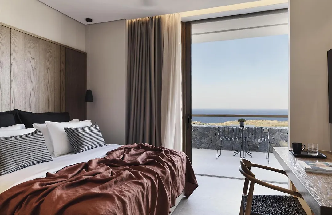Les chambres anti-allergènes sont équipées d'un presse-pantalon et de la climatisation, ainsi que des équipements modernes tels que la TV à écran plat avec des chaînes satellite. Elles sont dotées des fenêtres insonorisées. Elles sont également équipées d'un minibar et d'une cafetière/théière. Les clients peuvent également utiliser une douche à l'italienne et une toilette séparée, en outre un sèche-cheveux et des draps de bain sont aussi fournis. Quelques chambres proposent des vues sur la Mer Égée.